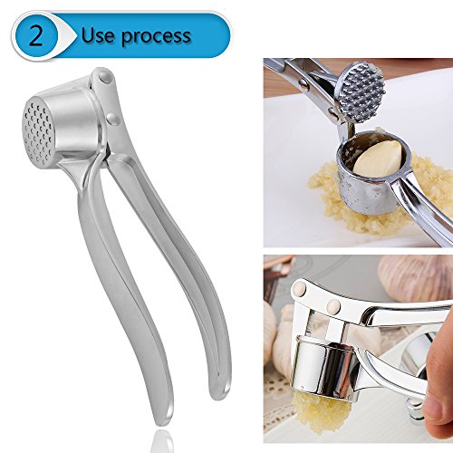 EASY SQUEEZE. Convex point design on the top makes garlic crushed slimsy; Stripper plate can move back and forth amd evenly crush the ginger, which gives your food great strong garlic flavor without big visible pieces of garlic in it.