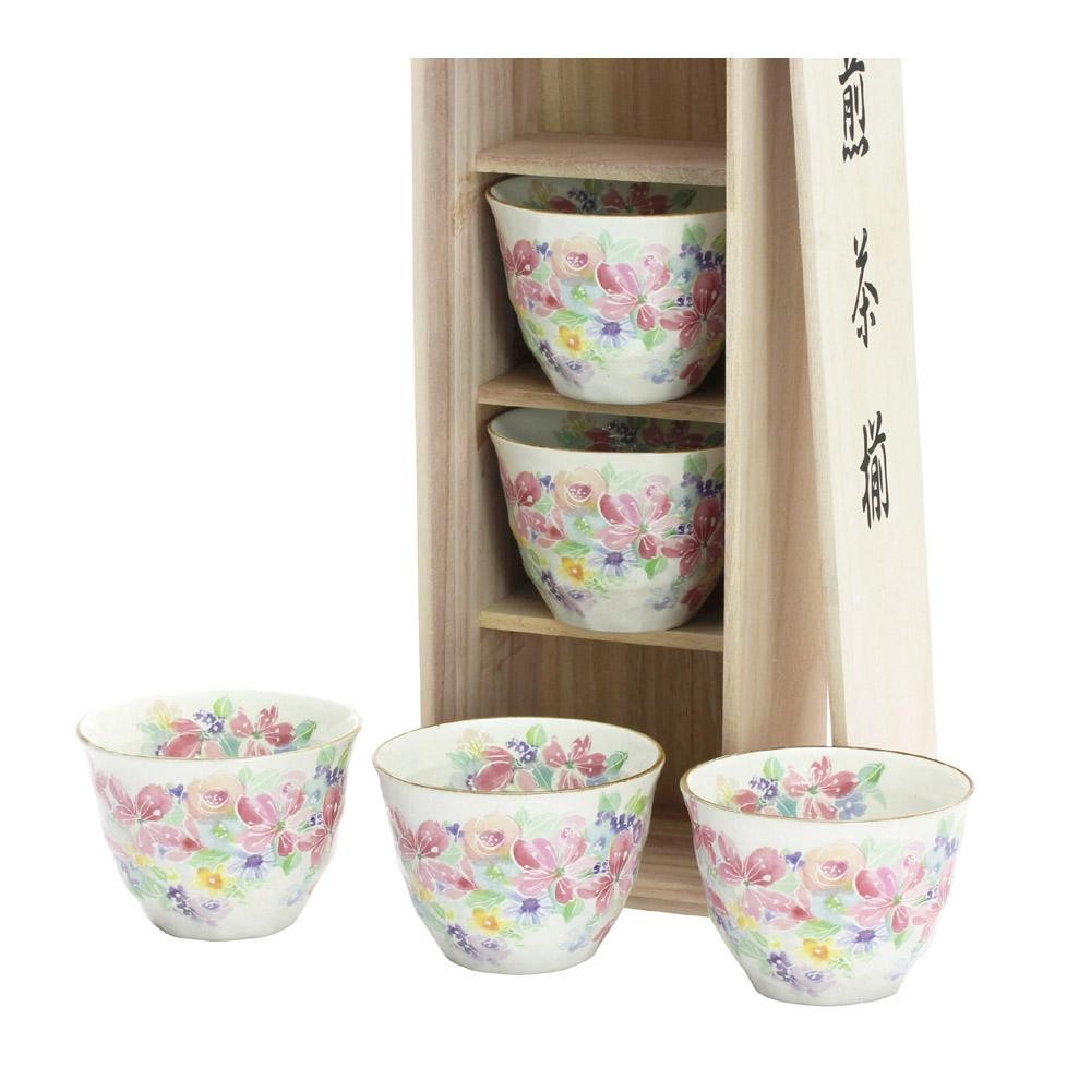 桜をはじめ、様々な花をちりばめた煎茶碗5個セットです。大切な方へのギフトにも最適です。