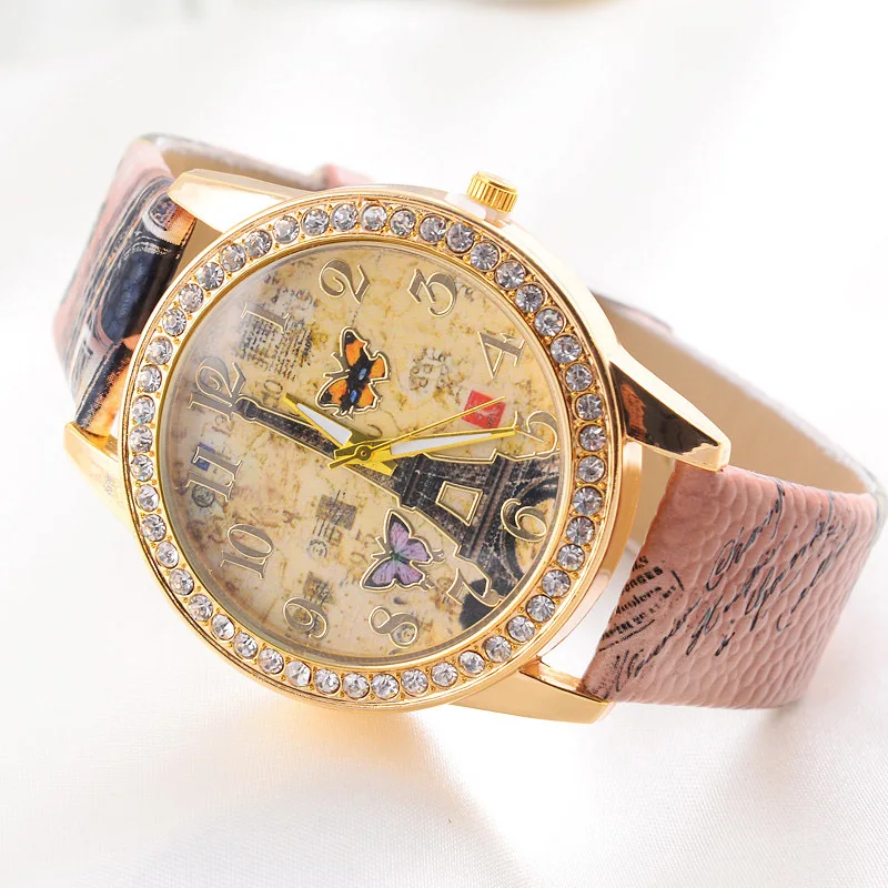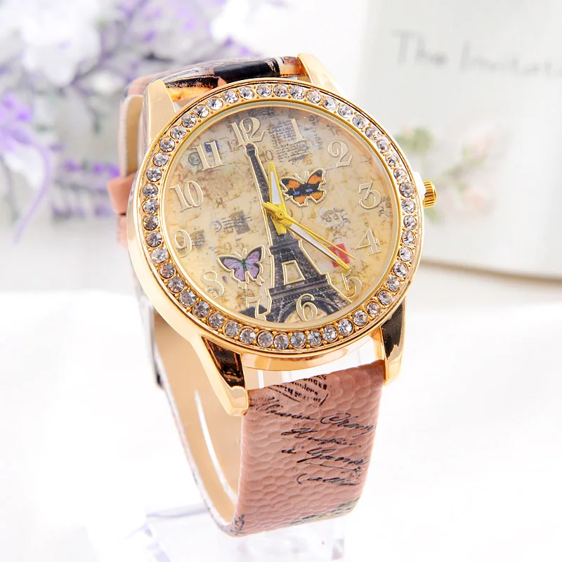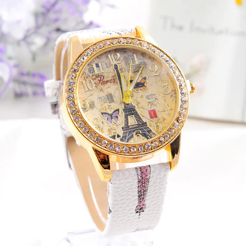 1PC Mullticolor Special Design Fashion Style Clock Paris Tower Butterfly Leather Hour Time Women Watches Montre Femme Large Discount(without retail package)