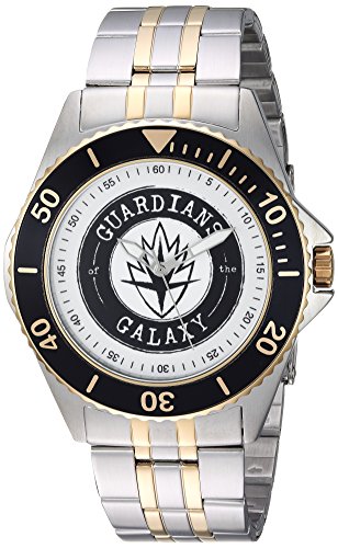 Item model number: WMA000121 Batteries: 1 Nonstandard Battery batteries required. (included) Date first listed on Amazon: July 27, 2017 Brand, Seller, or Collection Name:Marvel Model number:WMA000121 Part Number:WMA000121 Item Shape:Round Dial window material type:Mineral Display Type:Analog Clasp:deployant-clasp Case material:Stainless steel Case diameter:46 millimeters Case Thickness:12.5 millimeters Band Material:Stainless steel Band length:10 inches Band width:22 millimeters Band Color:Two Tone Dial color:White Bezel material:Plastic Bezel function:Unidirectional Movement:Analog quartz Water resistant depth:330 Feet
