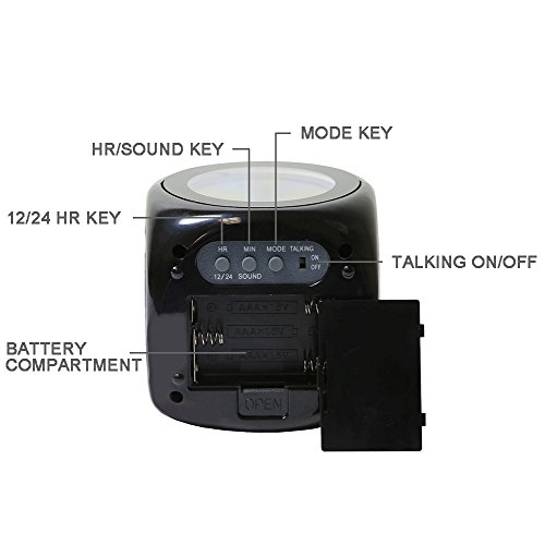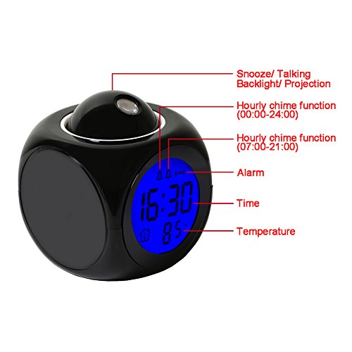 Function: LCD time temperature display with backlight. 12/24 Hour display. Alarm with 10 minute Snooze function. Voice talking function tell the current time in English. Dual CHIME Function: CHIME1--every hour CHIME2--only from 7:00am to 9:00pm Five kinds of alarm sound selectable.