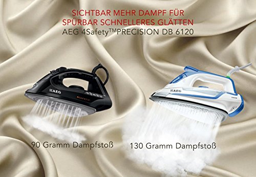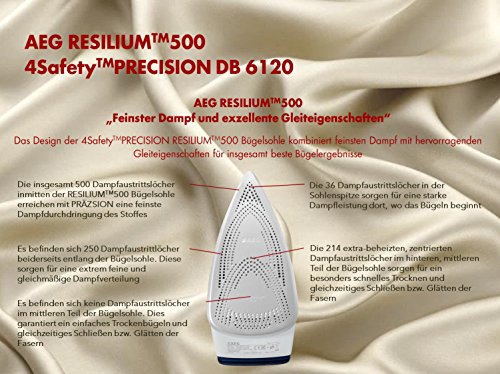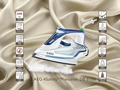 -. Binding : Haushaltswaren -. Brand : AEG -. Color : Blau -. EAN : 7332543277896 -. Feature : Inklusive Garantieverlängerung um 1 Jahr auf 3 Jahre / Beste Bügelergebnisse dank 2200 Watt und 130 g Dampfstoß sowie 0-40 g/min variablen Dampf / Beste Gleitfähigkeit und optimale Dampfverteilung dank der Resilium Bügelsohle mit 500 Dampfaustrittsöffnungen / Die speziell geformte Dampfbügelspitze gleitet optimal auch an schwer zugänglichen Stellen / 3-fache Sicherheitsabschaltung mit einem permanentem Sicherheitslicht und akustischer Warnung / Einfach zu befüllender XL Wassertank mit 350 ml Fassungsvermögen / Anti-Kalk-System: Selbstreinigend mit permanent integrierter Anti-Kalk-Patrone / Zubehör-Empfehlung: Bügelsohlen-Reiniger AEG AUC2 und Bügeleisen-Unterlage AEG AES067 -. Label : AEG -. Manufacturer : AEG -. Model : DB 6120 -. MPN : DB 6120 -. PackageQuantity : 1 -. PartNumber : DB 6120 -. ProductGroup : Küche & Haushalt -. ProductTypeName : KITCHEN -. Publisher : AEG -. Studio : AEG -. Title : AEG Dampfbügeleisen 4Safety Precision DB 6120 (2200 Watt, 130g Dampfstoß, Resilium 500 Bügelsohle, Abschaltautomatik, Anti-Kalk System) blau/weiß