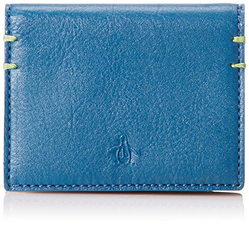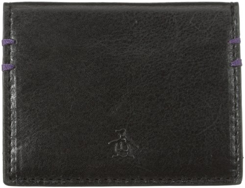 Slim card holder with pebbled leather exterior and signature penguin-logo stamp