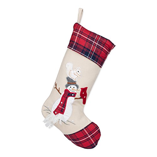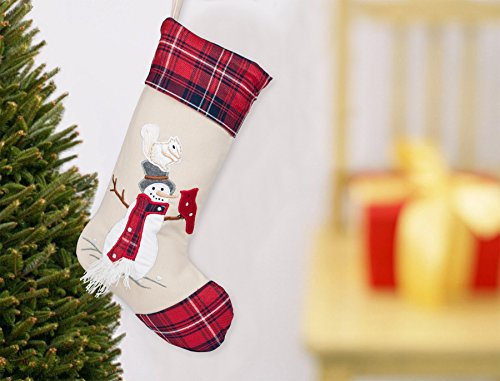 19 inch Squirrel on Snowman Top Hat Embroidered Christmas Stocking with Red Plaid Cuff