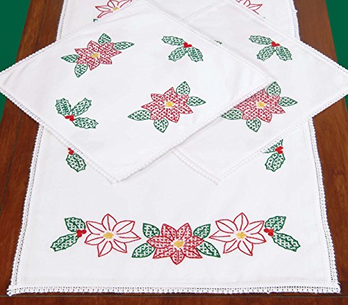 Jack Dempsey Stamped Dresser Scarf and Doilies Lace Edge, Poinsettias