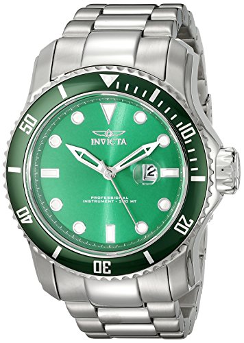 -. Binding : Watch -. Brand : Invicta -. Department : mens -. EAN : 0886678248421 -. Feature : Round watch with green sunray dial featuring luminous skeleton hands and markers, tonal bi-directional rotating bezel, and magnified date window / 48 mm stainless steel case with mineral dial window / Swiss quartz movement with analog display / Stainless steel band with fold-over-clasp-with-safety closure / Water resistant to 300 m (984 ft): in general, suitable for mixed-gas diving -. Label : Invicta -. Manufacturer : Invicta -. Model : 20096 -. MPN : 20096 -. PackageQuantity : 1 -. PartNumber : 20096 -. ProductGroup : Watch -. ProductTypeName : WATCH -. Publisher : Invicta -. Studio : Invicta -. Title : Invicta Men's 20096 Pro Diver Analog Display Swiss Quartz Silver-Tone Watch -. UPC : 886678248421