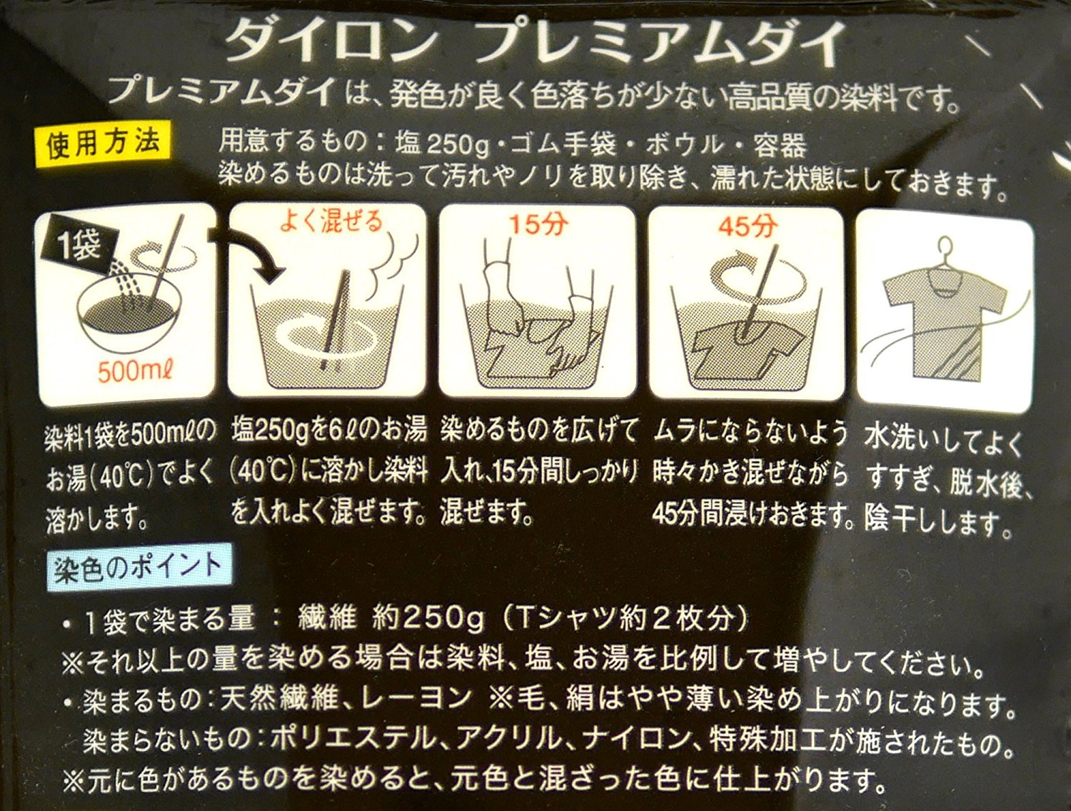 Amount to dye with one bag: About 250 g fibers (about 2 T-shirts)