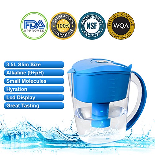 Alkaline Water Pitcher allows for 3.5L of crisp, ionized water refreshing, alkaline . It is the ultimate Alkaline Water Filter Pitcher. STOP WASTING WATER BOTTLES and start adding Alkaline Benefits to your drinking water. This pitcher will deliver FRESH, INSTANTLY FILTERED ALKALINE WATER utilizing our 7 Stage Premium Cartridge consisting of ION EXCHANGE RESIN, TOURMALINE, MINERAL BALLS, & CARBON. The cartridge REMOVES chlorine, odors, heavy metals and 90% of all zinc, copper, lead and pollutants to create an amazingly delicious alkaline beverage. REMOVES FREE RADICAL and ELIMINATES TOXINS with powerful ANTIOXIDANTS, and HIGH NEGATIVE ORP (Oxidation-Reduction Potential is a measurement to oxidize contaminants)Feature