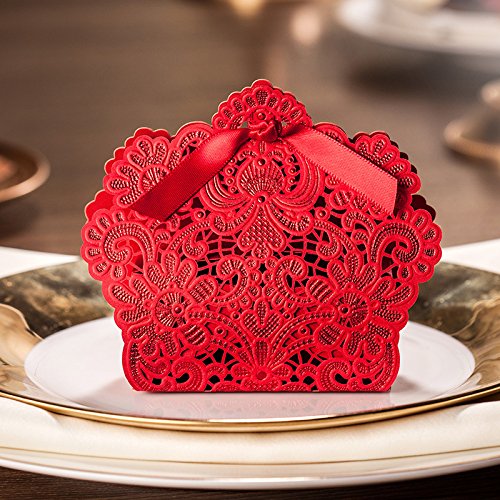 - An exquisite lace design with touches of red makes these favor boxes look both feminine and regal and with a ribbon on top, these are easy to open and close.