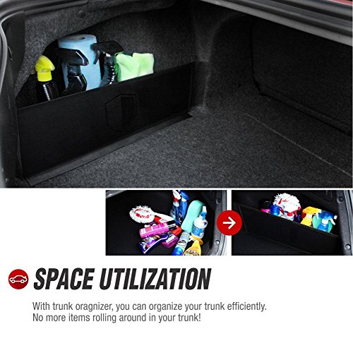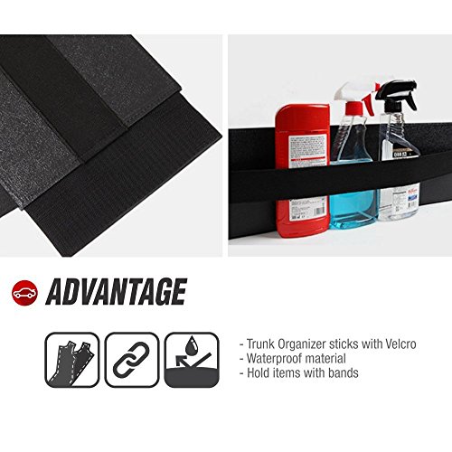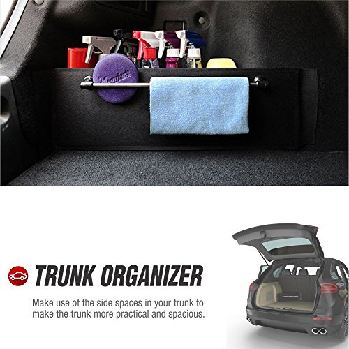"SIMPLE & EASY TRUNK ORGANIZING SOLUTION"The constant shifting of loose items in the trunk can drive you really nuts. Convert those inefficient space in your trunk to your advantage! Do you hate having a messy trunk? Worry no more! You can organize all your items in the trunk with this trunk organizer. Most cars come with weird angles in the trunk and this trunk organizer can block those angles so you can use it to store your items. The material is made with high quality faux leather so it is waterproof. It can easily be cleaned with mild soap, tissue, or wet cloth. It's very simple to install. All you need to do is attach velcro on the sides and the bottom. The organizer is an open design so it'll not hold odor like in a concealed space. It also has an elastic strap for those items that fall easily. The trunk organizer also comes in 2 pack so you can make both sides of your trunk useful! There is also a towel rack to hold all your towels, wet or dry.