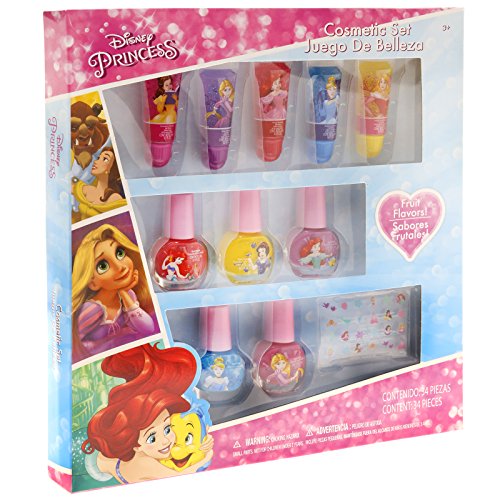 Throw a party or give a gift of an officially licensed Disney Princess cosmetic kit. Set includes: Lip gloss, nail polish and nail stickers. Each item in these kits is decorated with images of everyone's favorite Disney Princesses. Non-toxic and water-based formula makes these cosmetics safe for your young ones aged three years old and older. See bullets and images for more information.