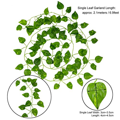 - Each leaf garland has 80 pieces of leaves; 12 * scindapsus aureus garlands in total. Each greenery garland is about 6.9 feet/ 2.1 meters long. The leaf is about 3 to 4cm.