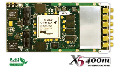 -. Feature : Virtex 5 SX95T with 512 MByte DDR2 DRAM / Two 14-bit TI ADS5474 ADCs / Two 16-bit 500 MSPS DACs / PCIe x8 Host Interface / Suite of Windows, Linux Drivers and Software Libraries