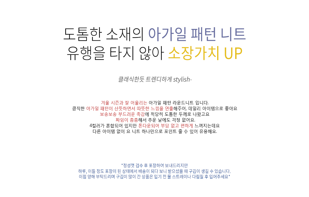 | 소재(Material) | 폴리(polyester/)26%+스판(spandex/)3%+아크릴(acrylic/)71% |