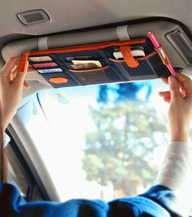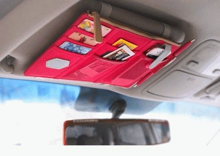 Pengendara mobil pasti seringkali ngalamin bingung taruh karcis parkir (untuk sementara), ponsel, permen, uang simpanan (jaga-jaga kalau kena tilang :p). Walaupun di mobil terdapat berbagai laci, atau kotak-kotak untuk taruh ini itu, tapi seringkali malah terlihat berantakan. Makanya perlu banget Sun Visor Car Organizer ini.