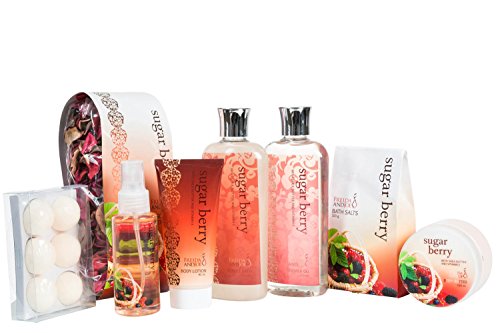 Red Tan Tapestry Box: The Tapestry Sugar Berry Fragrance Spa Set comes in a red and tan striped, fabric-covered box. The rich design of this holder will enhance an elegant powder room or bathroom. Gift recipient will appreciate the set holder, in addition to the fragrances!