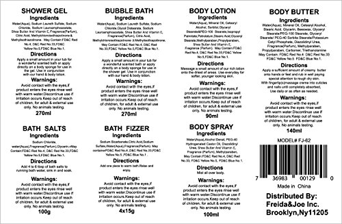 150ml body butter 90ml body lotion ,270ml shower gel 270ml bubble bath 270ml bubble bath 100g bath salts i 100ml body spray 6 bath fizzers Ribbon & tag