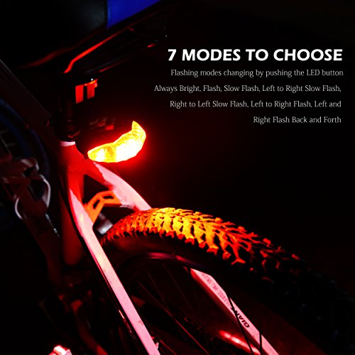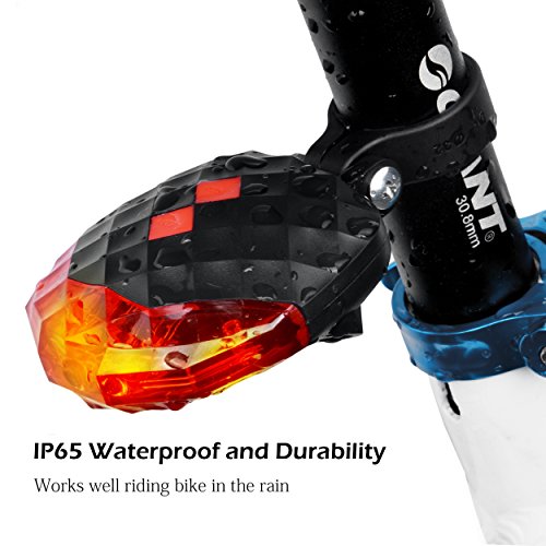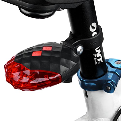 -. Feature : Innovative Laser Light: Rear bike light design with Laser lights and 5 LED lights. It offers a super bright laser light on both sides of the bicycle to keep your safety.Double warning signals more easily allow you to be seen by motorists / 7 Flashing Modes: Bright, flash, slow flash, left to right slow flash, right to left slow flash, left to right flash, left and right flash back and forth.You can choose the flash signals mode you need according to the road conditions / Super Easy to Install: Screw the mount onto the seat post and then slide the light onto the mount.Strong, even if the bumps, don't let you lose taillight.Laser taillights retaining clip can be adjusted,suit for the seat rod diameter 20-30mm / Weather Resistant: Whether it is rain or sunshine, summer or winter, visibility can be improved at any time.You will be safe in cycling.IPX-2 Water resistant rated protected against, tilt 15 degrees Anti-rainwater . But it can not dive! / Convenient Removable Battery: Powered by 2 AAA batteries (batteries not included). Detachable batteries can be backed up so that you don't worry about the bike tail light without electricity, especially when riding in the wild