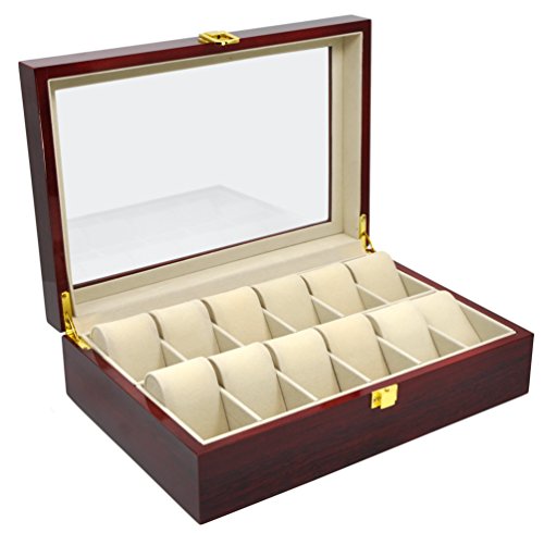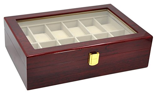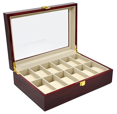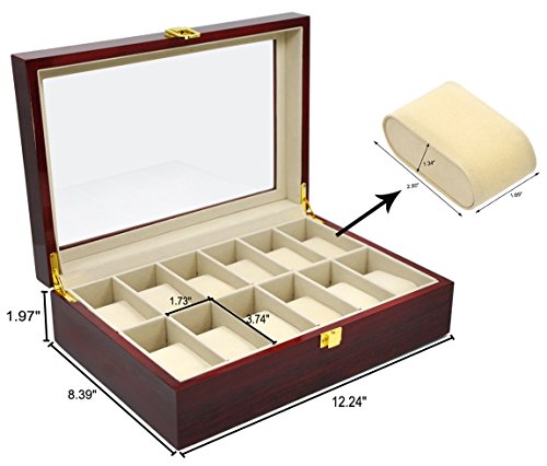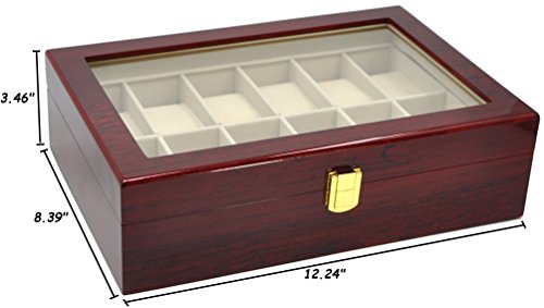 - Title : ADTL Wood Watch Box Jewelry Display Storage Case for 12 Watches Glass Top Purplish Red