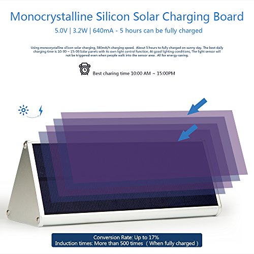 【FAST CHARGING & LONG WORKING HOURS】: Rxment Solar Powered Lights Use monocrystalline silicon solar charging, Larger solar panel, 580mA/h charging speed. About 5 hours to fully charged on sunny day. 3000mA Lithium Iron Phosphate Battery, high efficiency, no memory characteristics. It will not be influented normal working even though on a cloudy day charging.