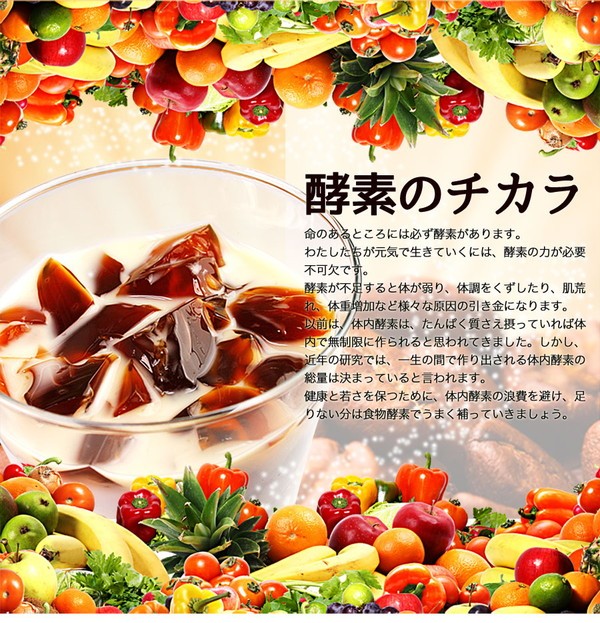 コーヒー:コーヒー、食物繊維(難消化性デキストリン)、コラーゲンペプチド、砂糖、植物発酵物乾燥粉末(デキストリン、黒糖、果物(オレンジ、パイナップル、バナナ、リンゴ、パパイア、グァバ、メロン、アボガド、アセロラ、ドライプルーン、レモン、洋梨、レーズン、マンゴー、すいか、スターフルーツ、キウイフルーツ、カムカム、アサイー)、野菜(しいたけ、カボチャ、さつまいも、トマト、にんじん、マンジョッカ、ピーマン、赤カブ、ヤーコン、大根、キャベツ、ゴボウ、コウベマンテイガ、チコリ)、野草エキス(パフィア、ローズマリー、カツアバ、紫イぺ、キャッツクロー、綿実、シナモン、レモングラス、カルケージャ、すぎな、シャペウ・デ・コウロ、アガリクス、アニス、マテ、ステビア、ウイキョウ、ショウガ、ガラナ、ハトムギ、パッションフルーツ、ムイラプアマ葉、パタ・デ・ヴァカ、ぺドラ・ウメ・カ、ピカオプレト、アマチャヅル、クローブ、ガジュツ、レンコン)、穀物(玄米、オーツ麦、とうもろこし、大麦、黒ごま、きび、ライ麦、ポップコーン(爆裂種))、豆類・ナッツ類(エンドウ豆、ブラジル豆、紫ブラジル豆、小豆、大豆、黒ブラジル豆、レンズ豆、ひよこ豆、カシューナッツ、パラナッツ)、海藻類(わかめ、昆布、海苔)、ハチミツ)、ゲル化剤(増粘多糖類)、香料、甘味料(スクラロース、アセスルファムK)、V.C、抽出V.E、ナイアシン、パントテン酸Ca、V.B1、V.B6、V.B2、V.A、葉酸、V.D、V.B12、(原材料の一部にゼラチンを含む)