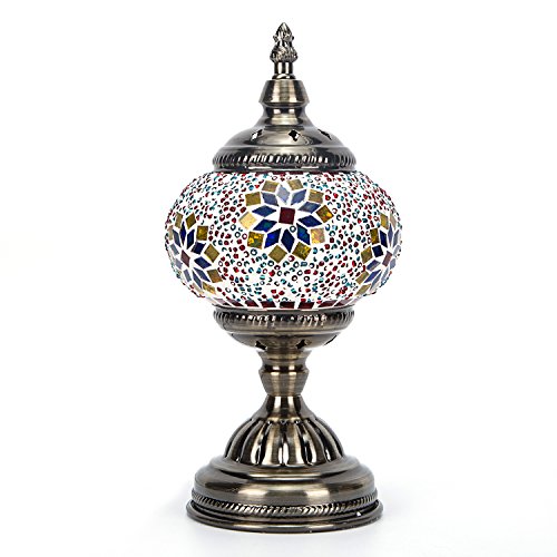 -. Feature : 100% HANDMADE: The handmade mosaic glass table lamps are uniquely hand made by experienced artisans with Turkish style to create a warm ambiance of romantic intrigue and to also decorate your room, pub or coffee house. / BEAUTIFUL WORK OF ART: Our handmade table lamp can be artfully displayed. It comP.R.Ises a bronze metal body and swan neck arm with mosaic lantern that make it look pretty and stunning when it is light up at night. / HIGH QUALITY AND DURABLE: Our Turkish Moroccan Handmade Lamps are made using quality materials. They are brand new, personally checked and will not compromise on quality. They are made of high quality metal and extra fine cut colored glass that are designed to last for generations. The glass is colored stained glass throughout and will not fade.Electric wire and E14 LED lighting bulb included / UNIQUE DESIGN: The Turkish glass mosaic table lamp is uniquely crafted by making use of precision cut pieces, it contains cut glass piece which are carefully placed together to produce a special lamp pattern on a unique lamp shade.Our handmade table lamp brings the perfect ambiance to your room. It is stylish and fits any décor. It is great for mood or accent lighting.Height : 29 cm(11.4"), Weight : Approx. 0.7KG(1.4 lb) / 100% MONEY BACK GUARANTEE: Our Turkish handmade table lamps are backed by 100% satisfaction policy. Try them out at our expense and if you are not fully satisfied, we will offer you a 100% no questions asked refund.