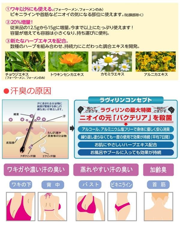| もうオヤジ臭いとは言わせない!男のデオドラントクリーム!海水浴、プールに入っても消臭効果は持続します。イスラエル産の厳選した天然ハーブを独自調合により得られたエキス、クラヴィリンを毛穴から浸透させて、臭いの原因菌バクテリアに直接働きかけるので効果が長続き。 |