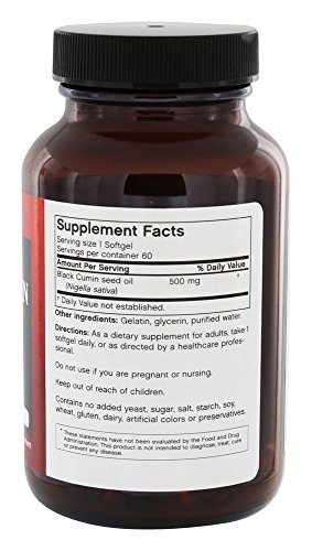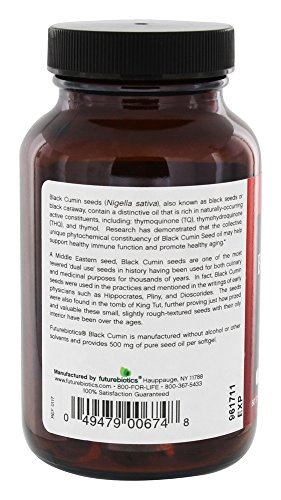 Black Cumin Seed Oil 60 SoftgelProduct DescriptionFuturebiotics Black Cumin softgels provide unrefined, virgin Black Cumin (Nigella sativa), seed oil manufactured without solvents. The oil is rich in naturally-occurring active constituents, including thymoquinone (TQ), thymohydroquinone (THQ), and thymol. Black Cumin oil may help support healthy immune function and promote healthy aging.*