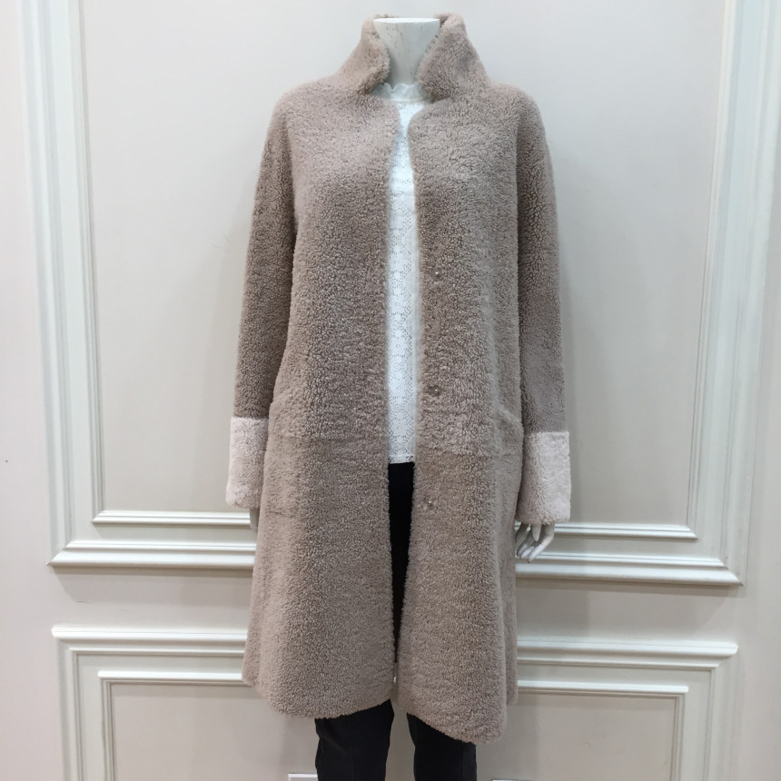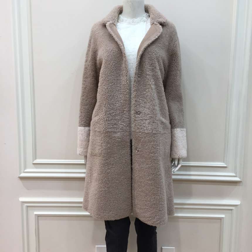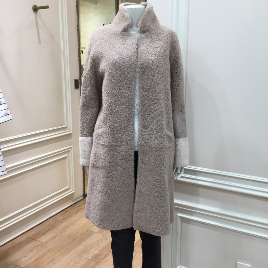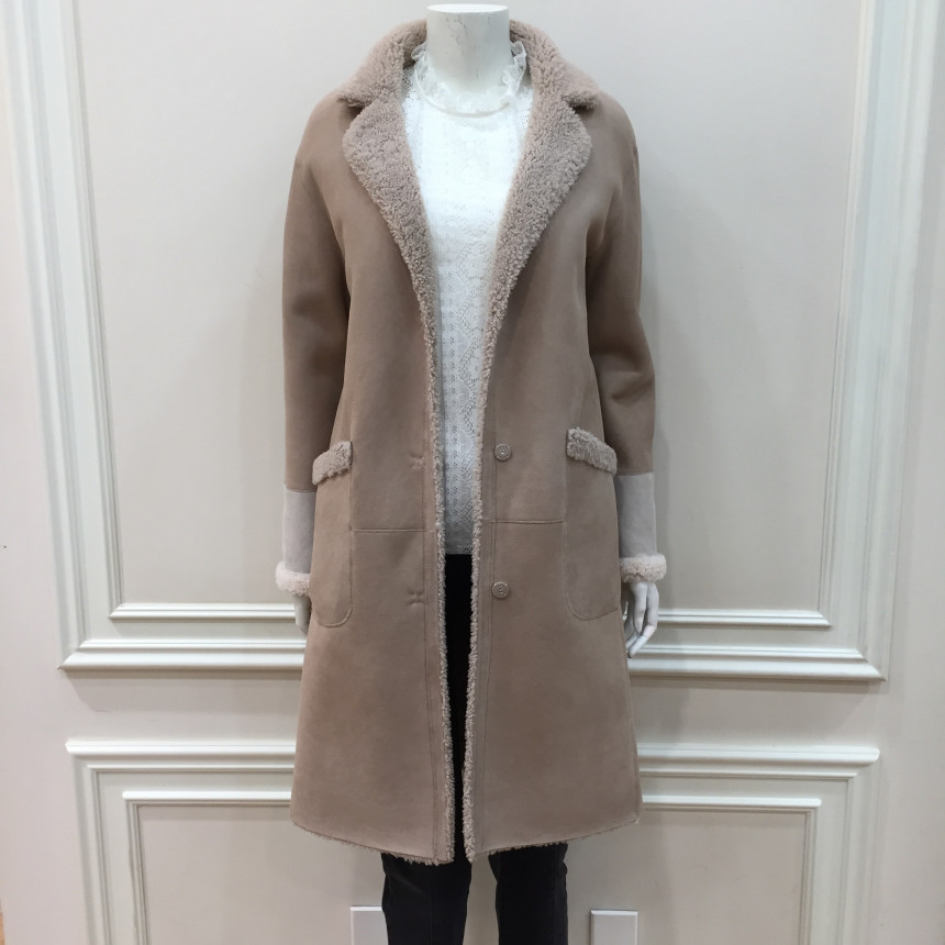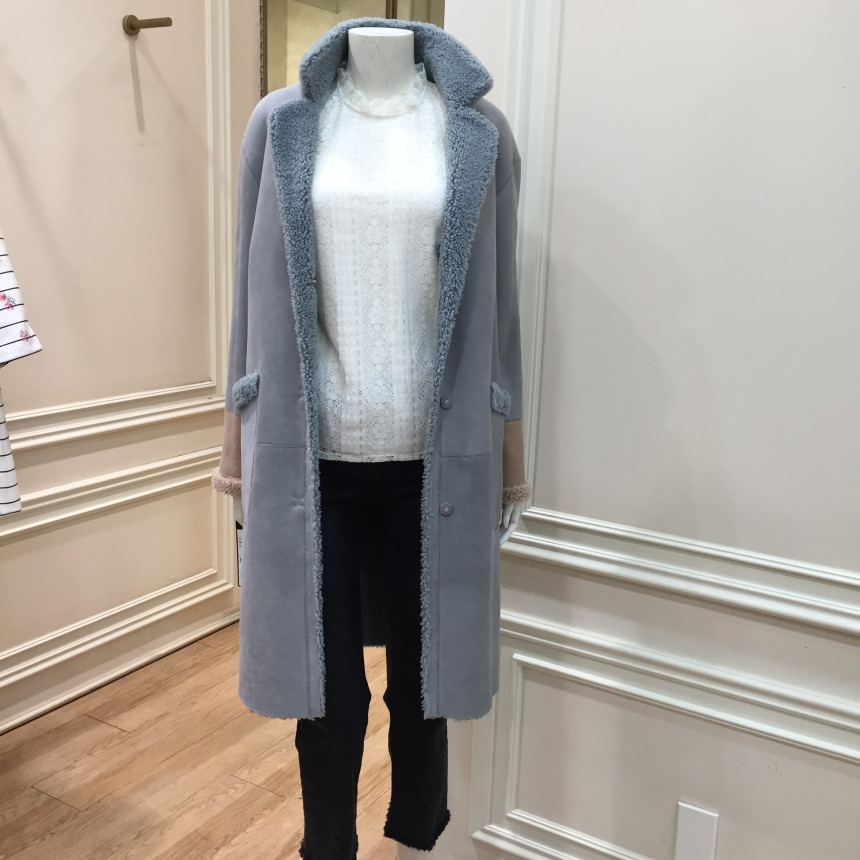 은은한 파스텔톤의 컬러감이 포인트인 레니본 양가죽 무스탕 코트입니다.