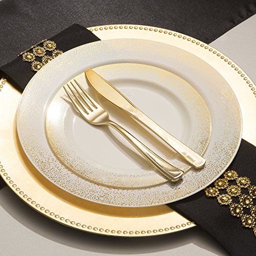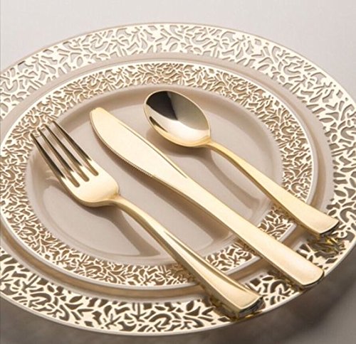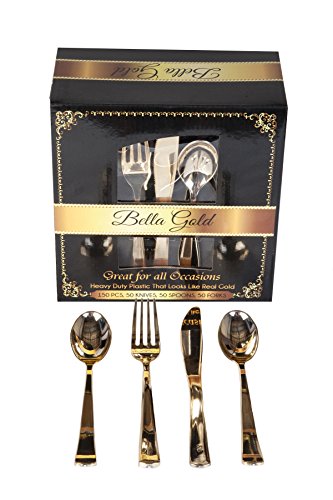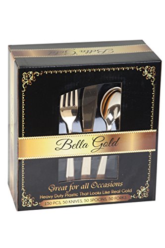 Bella Gold Cutlery- Gold heavy weight disposable silverware. 150 pieces- 50 forks, 50 spoons, 50 knives