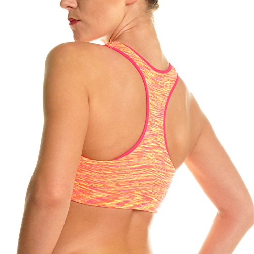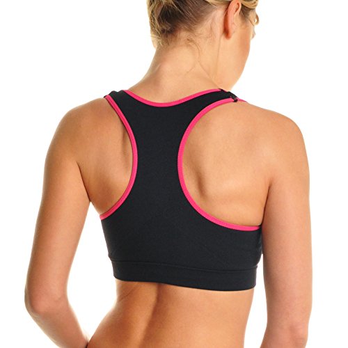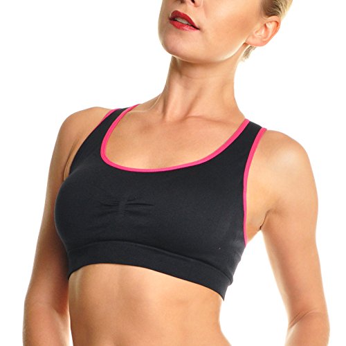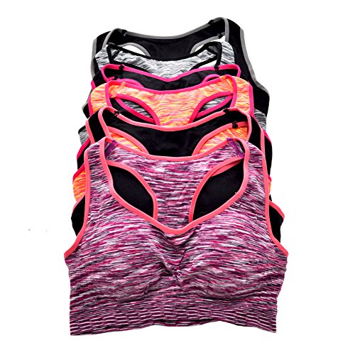 This seamless racerback sports bra provides light support for all kinds of indoor sports. Comes with double layer front panels and removable padding inserts as nipple concealers. 90% Nylon, 10% Spandex. One size fits up to bra size 38D. Hand wash in cold water, line dry.Feature
