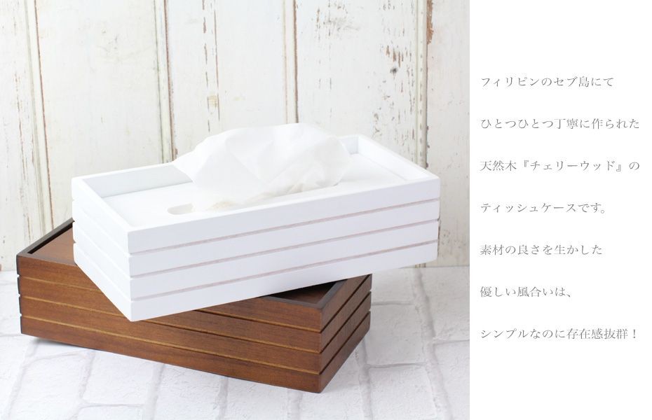 籐のある生活チェリーウッドシリーズ。フィリピンのセブ島で丁寧に作られた、天然木のティッシュBOXケースです。コンパクトタイプ、スリムタイプのティッシュボックスが入る、底のある箱型。選べる色は、どんなお部屋にも馴染むダークブラウンとアイボリーの全2カラーです。リビング、寝室、化粧台など、どこにおいても様になるのがうれしいシンプルなデザインとなっております。こちらの商品は、ロットごとにカラーの違いがございます。特にアイボリーは、クリーム寄りのお色や、白が強く出る場合もございます。一度に複数お買い求めしていただいた場合には、なるべくお色味を揃えさせて頂いておりますが、全く一緒の色というのは商品の性質上難しいので、その点ご理解の程宜しくお願い致します。■サイズ-28.5x13.5x7.5(h)cm■素材-チェリーウッド