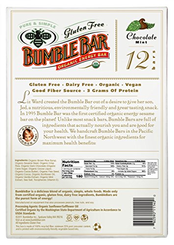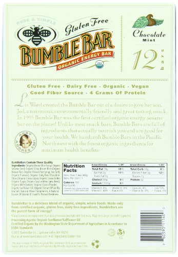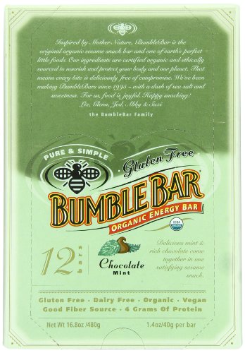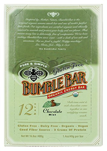Studio : BumbleBar, Inc. Publisher : BumbleBar, Inc. Binding : Grocery Product Description Founded in 1995, BumbleBar is the original brand of organic whole sesame and nut bars made from ingredients you can see and pronounce. ?Chocolate Mint is simply mouth watering nibs of almonds enhanced by the nutty, chewy sesame flavors of our original bar. An irresistible organic snack for nut lovers. Every BumbleBar has between 180 and 200 calories, 4-6 grams of fiber and 4-7 grams of protein. 0