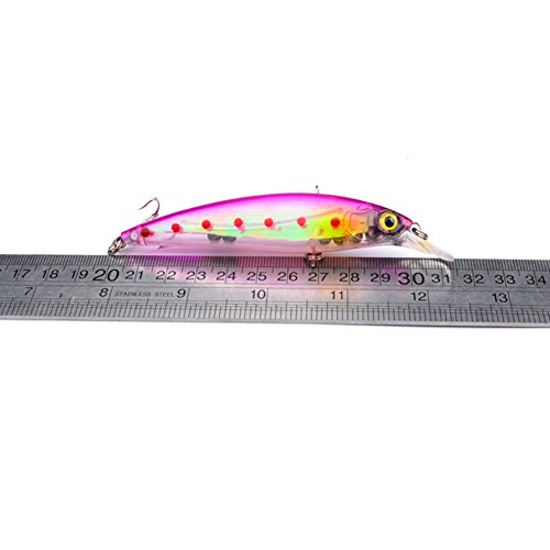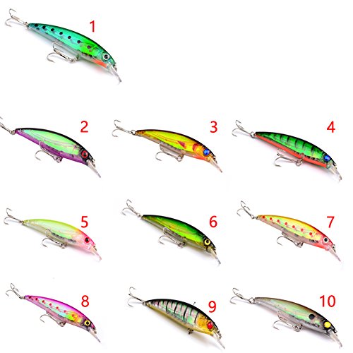 -. Feature : Durable ABS material, odor free and environmentally friendly. / Material:ABS length:11cm weight:13.4g Hook:4#high carbon steel treble hook style:10 color / Each comes with 2 sharp treble hook,High quality metal triple hooks strong enough to catch big fish,low decoupling rate! / Smooth and rapid diving action bright colors to attract big fish / They create life-like swimming actions in water!Great action at slow to very fast retrieve rates!