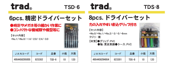 【商品名】 (業務用10セット)TRAD ドライバーセット/作業工具 【8本組】 TDS-8 〔業務用/DIY用品/日曜大工〕 【ジャンル・特徴】 力の入れやすい差し込みグリップ付き!8本組工具セット ■サイズ・色違い・関連商品■10セット[当ページ]■15個入 ハンドル付き TDS-15 2セット■15個入 ハンドル付き TDS-15 20セット■50セット ■商品内容 【ご注意事項】・この商品は下記内容×10セットでお届けします。常備工具の定番8pcドライバーセット●力の入れやすい差込グリップ付 ●セット内容 +0・+1・+2・‐3・‐5・‐6mm/クジリ・キリ■商品スペック●材質:グリップ PVC/軸:高炭素鋼/ケース PVC■送料・配送についての注意事項●本商品の出荷目安は【1 - 7営業日 ※土日・祝除く】となります。●お取り寄せ商品のため、稀にご注文入れ違い等により欠品・遅延となる場合がございます。●本商品は同梱区分【TS1】です。同梱区分が【TS1】と記載されていない他商品と同時に購入された場合、梱包や配送が分かれます。●沖縄、離島および一部地域への配送時に追加送料がか