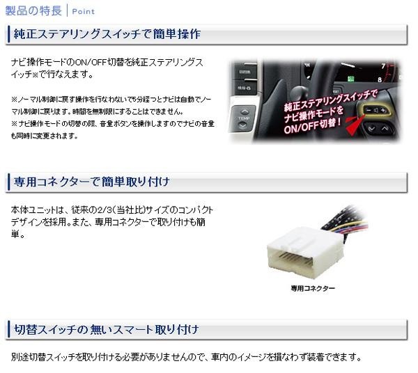 ナビ操作モードのON/OFF切替を純正ステアリングスイッチで行なうことができます。本体ユニットは、従来の2/3(メーカー比)サイズのコンパクトデザインを採用。また、専用コネクターで取り付けも簡単です。 |