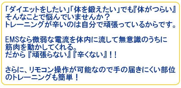 EMS(ElectricalMuscleStimulation)で約25分間のオートトレーニング!!テレビを見ながら、ゲームをしながら、お友達とおしゃべりしながらでもご使用いただけます!!本体での操作がしにくい脇腹・ヒップラインもリモコン操作で楽々トレーニング。トレーニングモード、リラックスモードの2モードを搭載し、15段階刺激調整で運動効果に合わせた設定が可能となっております。本体は繰り返し使える充電式タイプ。 |