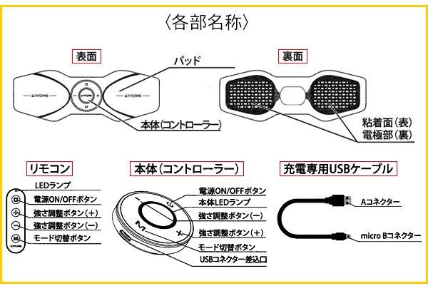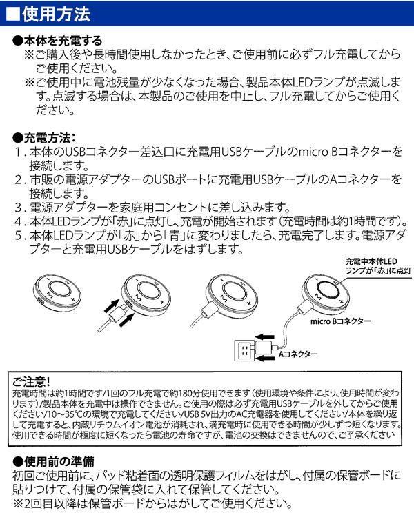 | 仕様 | ●強さ調整:15段階 ●充電ケーブル長:約0.3m ●パッド使用回数目安:約45回(1回25分間使用した場合) ●使用環境温湿度:0度~40度、20~80%RH ●保管環境温湿度:-10度~60度、20~80%RH ●自動電源OFF(約25分) ●無負荷電源OFF(約30秒) 【使用電源】 ●本体:USB充電式(1回1時間で約180分稼働) ●リモコン:コイン型リチウム電池(CR2032) 【動作モード】 ●トレーニングモード(4~35Hz低周波) ●リラクゼーションモード(1~116Hz) |