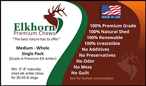 -. Title : Medium, Whole, Single Pack - Grade A Premium Elk Antler Dog Chew for 20 to 45 lb dogs – Naturally shed from wild elk – No Mess, No Odor – Made in the USA