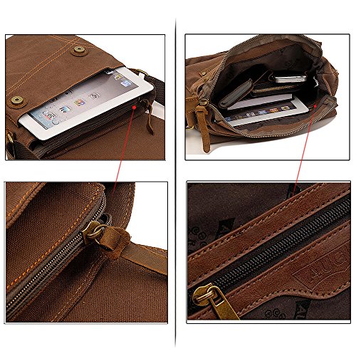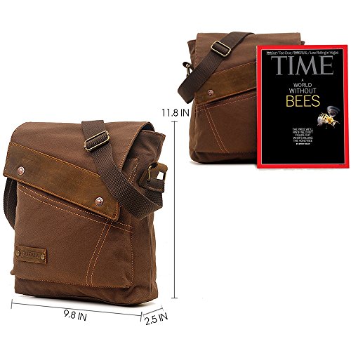 -. Feature : Material: High density durable canvas; Lining: cotton cloth. Size: 9.8"(L)*2.5"(W)*11.8"(H); Weight: 0.6kg/1.3 lb. it can hold A4 book, iPad or 10" tablet, purse, keys, and all sorts of little things right / Structure: Exterior: a sandwich pocket in front; Interior: a main compartment, an inside zip pocket, two side open pockets for cards and little items; Dual protection: out magnetic flap, inner top zip closure / Unique style: full grain dark brown leather and light colored metals that are perfectly match with canvas, and disorderly wrinkles that present the style of retro and wildness, which all show a good quality and feature on bag, let simple more stylish / Versatility: Adjustable shoulder strap allows you wearing on shoulder or across your body, either as a messenger or a sling bag is comfortable and perfect for working, short traveling and daily using. / Quality: High hardness vintage hardware, strong canvas and reinforce stitching, which prolong wear resisting. Unconditionally refund or free replaced if defective or any quality problems caused within 180 days, lifetime friendly customer service
