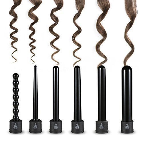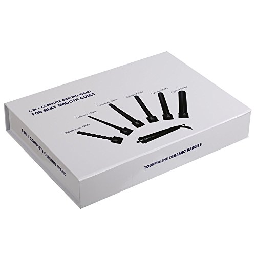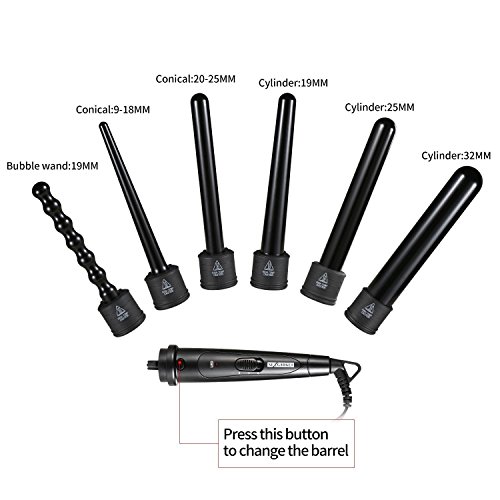 ONE SET FOR ALL CURLING STYLES: comes with 6 piece interchangeable tourmaline ceramic ion barrels, meets your different curling style needs. Barrels are in different shapes and sizes: cylinder 32mm, conical 20-25mm, bubble 19mm, cylinder 19mm, conical 9-18mm, cylinder 25mm. Change your hair style from beachy waves to tight curls yourself, enjoy the endless styling possibilities at home instead of hairdressing salon, save your money and precious time.