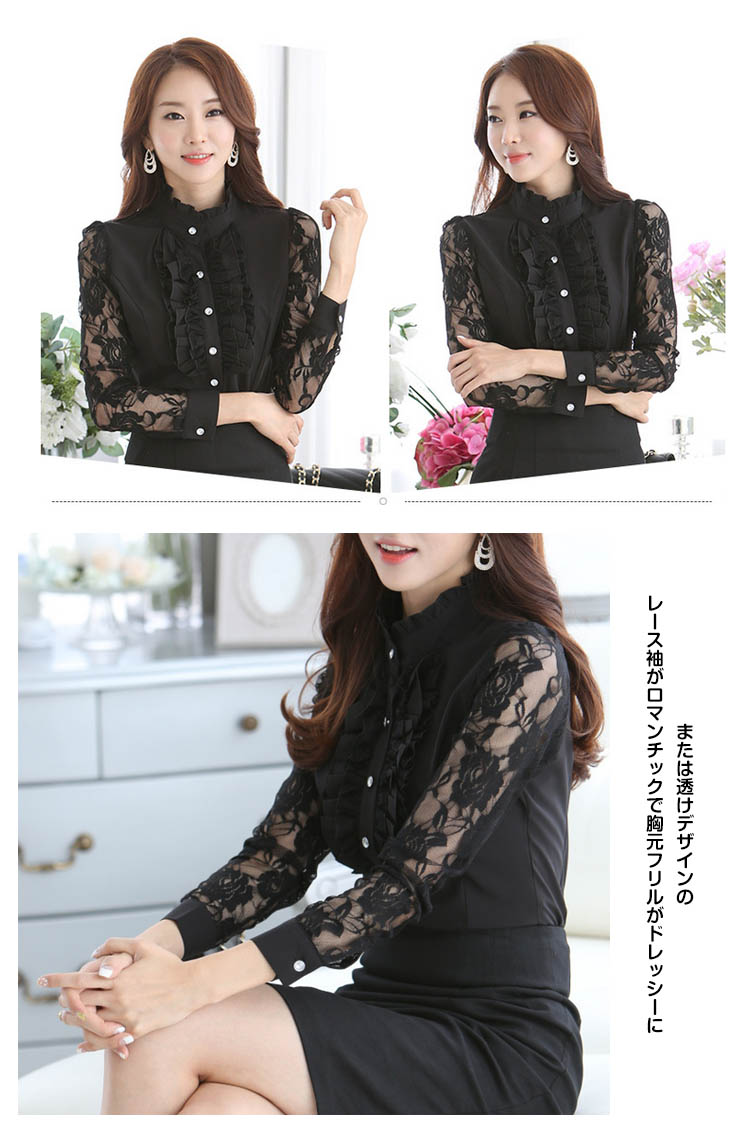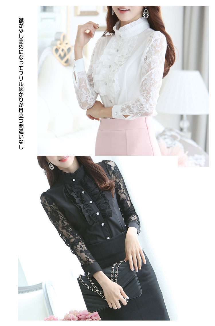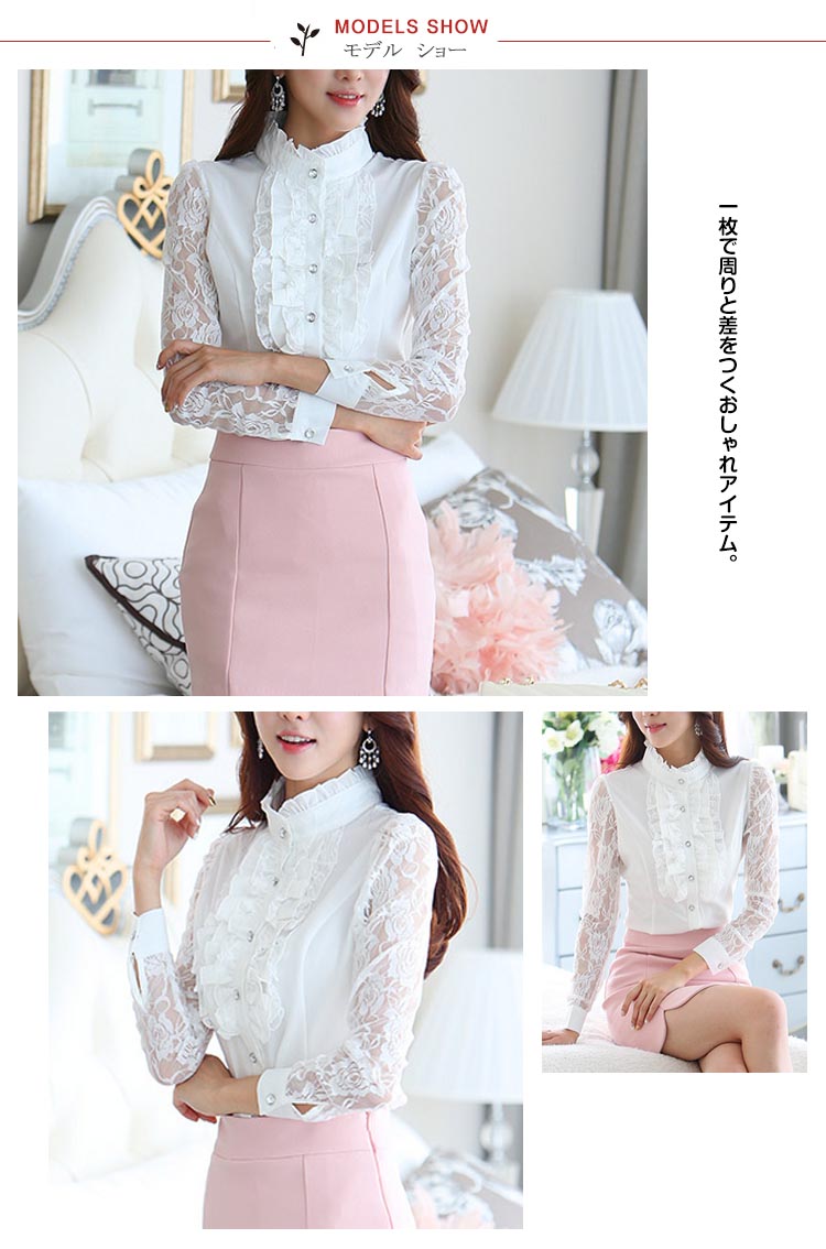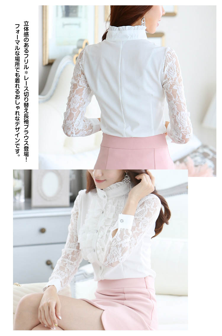 | 一枚で周りと差をつくおしゃれアイテム。立体感のあるフリル*レース切り替え長袖ブラウス登場!フォーマルな場所でも着れるおしゃれなデザインです。後姿もすっきりと360度どこから見ても綺麗。襟が少し高めになってフリルばかりが目立つ間違いなしまたは透けデザインのレース袖がロマンチックで胸元フリルがドレッシーにコーデ次第で可愛くてキュートにも優雅にエレガントにも使い勝手色々なフリルブラウスは一枚あると万能! | |