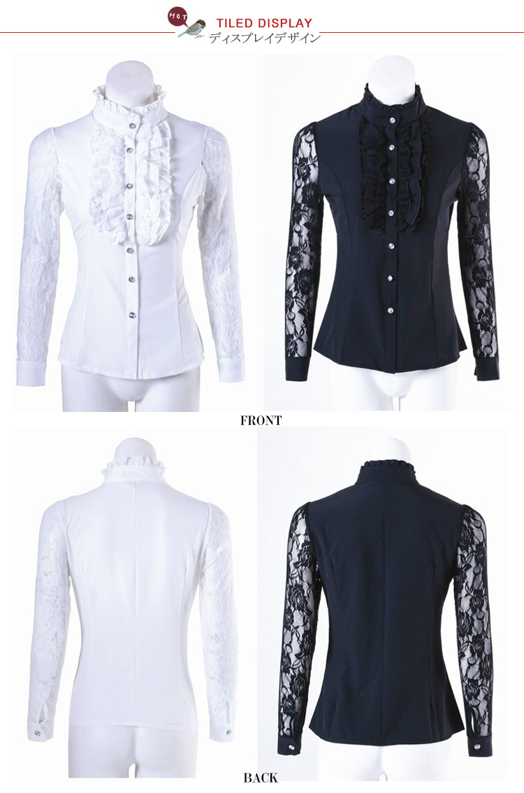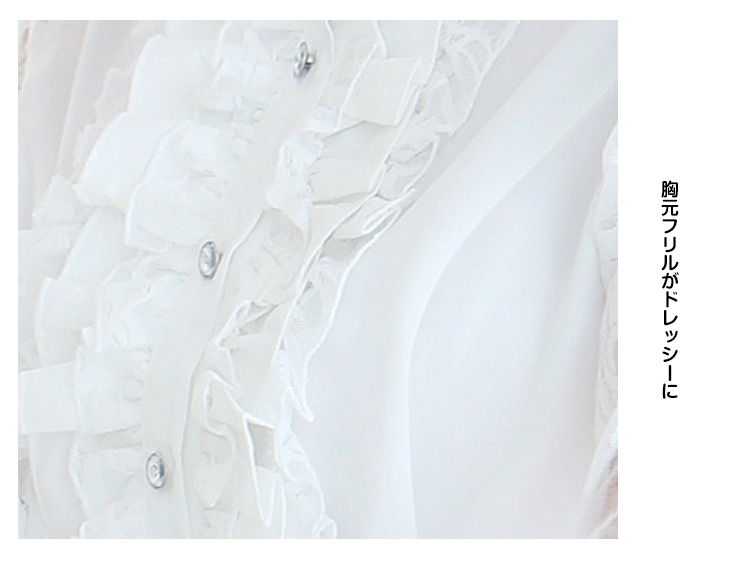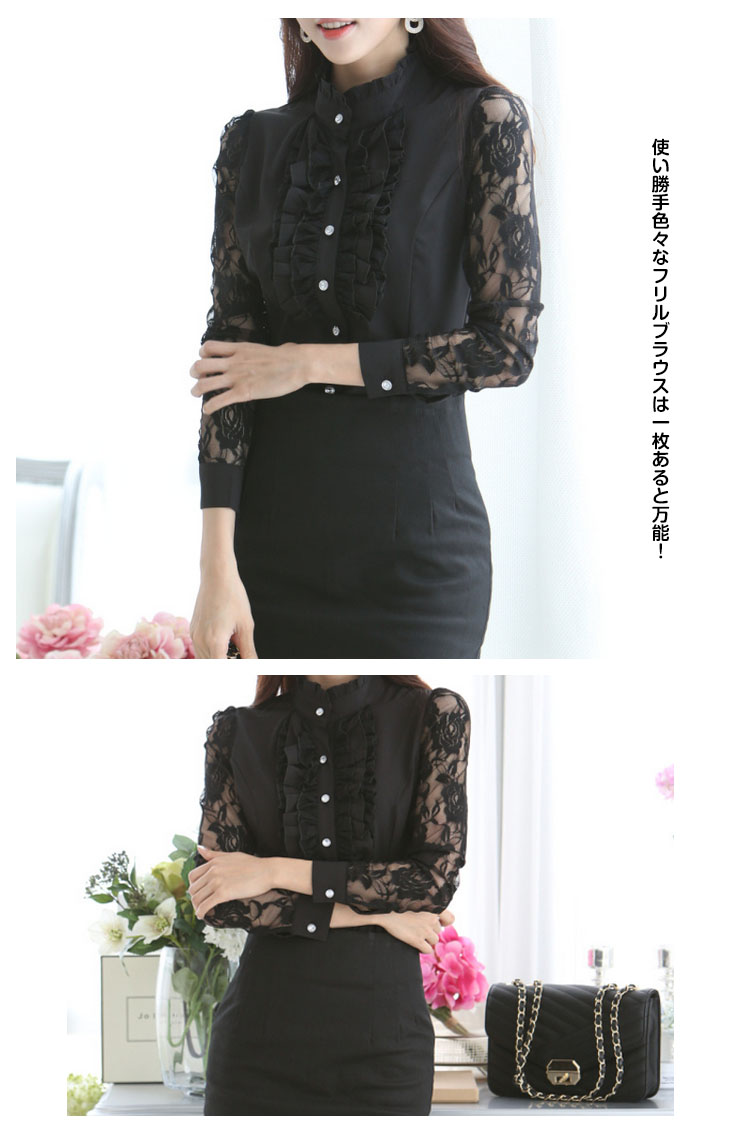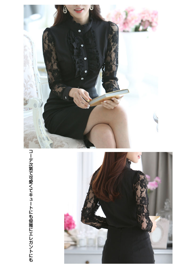 | 一枚で周りと差をつくおしゃれアイテム。立体感のあるフリル*レース切り替え長袖ブラウス登場!フォーマルな場所でも着れるおしゃれなデザインです。後姿もすっきりと360度どこから見ても綺麗。襟が少し高めになってフリルばかりが目立つ間違いなしまたは透けデザインのレース袖がロマンチックで胸元フリルがドレッシーにコーデ次第で可愛くてキュートにも優雅にエレガントにも使い勝手色々なフリルブラウスは一枚あると万能! | |