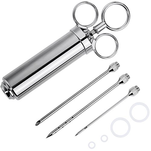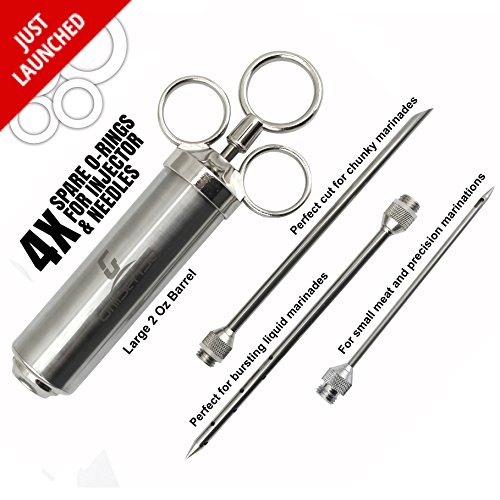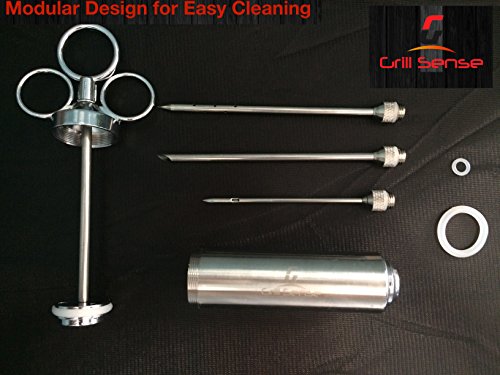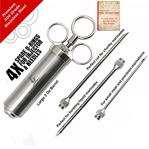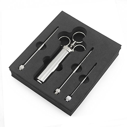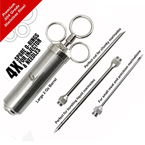 5 Star(★★★★★) Reasons to buy Grill Sense Meat Injector○ Finest in craftsmanship and build-to-last Meat injector set that gives you unlimited possibilities to add incredible flavor and tenderness to any type of meat. ○ Made from 304-food-grade stainless steel and outfitted with a barrel that has a 2 oz capacity, this isn't your average marinade injector. You won't find a better meat injector anywhere. ○ Prepare the meat so tender you can cut it with your fork, a steak so juicy it bursts with flavors when you cut into it. ○ With our Grill Sense Meat-Injector your meat will be perfectly cooked on the outside, tender and juicy on the inside. Serve it to your family and friends or present it to a true grill connoisseurs, everyone will be impressed. ○ We at Grill Sense have a passion for grilling and we bring that passion to you and your family through our world-class meat injector. Buy with confidence. Your high-quality meat injector is made up of 100% safe 304-grade premium stainless steel. Your package includes ■ Injector barrel with plunger ■ 3 specially designed marinade needles ?? ? Long Food grade 304 Stainless Steel needle with an angled cut for chunky marinades ?? ? Long Food grade 304 Stainless Steel needle with 12 holes for liquid marinades ?? ? Small Food grade 304 Stainless Steel needle for precision marinating ■ BPA free food grade O-rings to prevent leakage of marinade. With our Professional grade marinade injector, everyone is a chef. Go impress the world! Use with any kind of marinade sauce- Chicken marinade, steak marinade, pork marinade, brisket marinade, rotisserie, rib. Companion grill accessories for Turkey Baster, Turkey Fryer, Meat tenderizer, 0 |