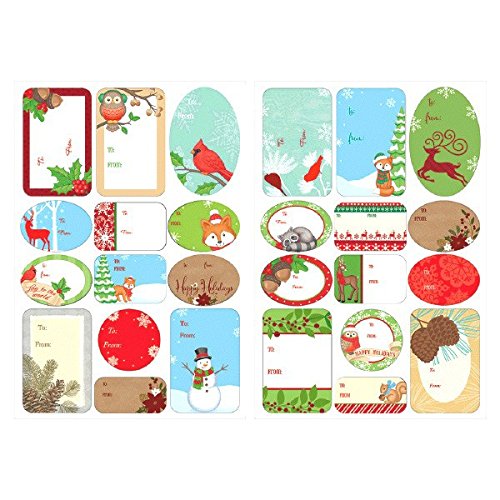 Adhesive gift tags featuring acorns, Holly, snowman and adorable forest animals like owls, reindeer, foxes, squirrels, and Cardinals