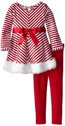 -. Feature : Beautiful 2-piece dress & legging set from Bonnie Jean. / The long sleeve Santa dress features sequins and mitered stripe allover, red satin sash & bow trim at waistline, and wrap around bow tie on back, white santa fur trim at inserted hem, round neckline, a single button back closure. Come with coordination solid red knit leggings. A warm & stylist outfit that can be worn during the upcoming Christmas & holidays. / Outfit is made of cotton & polyester. / A warm & stylist outfit that can be worn during the upcoming Christmas & holidays.
