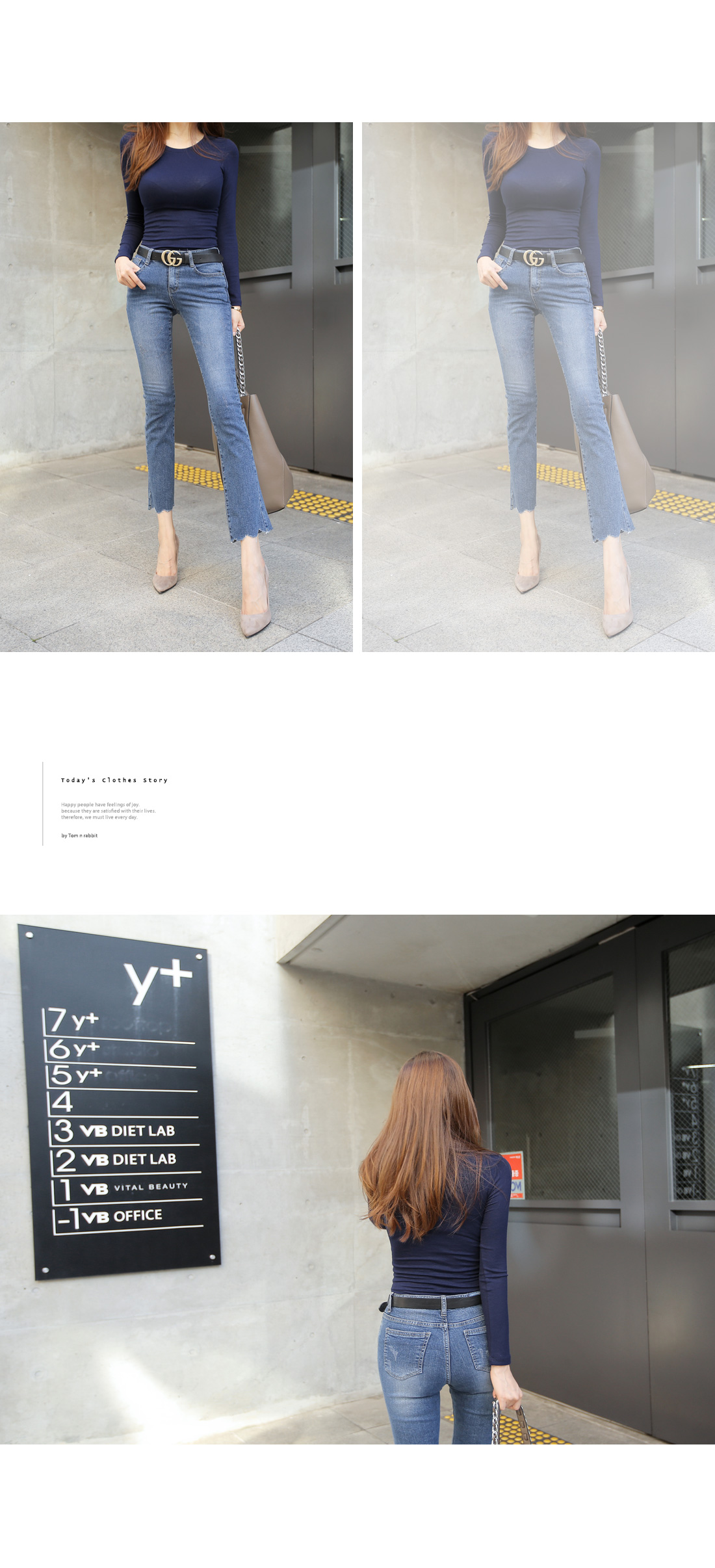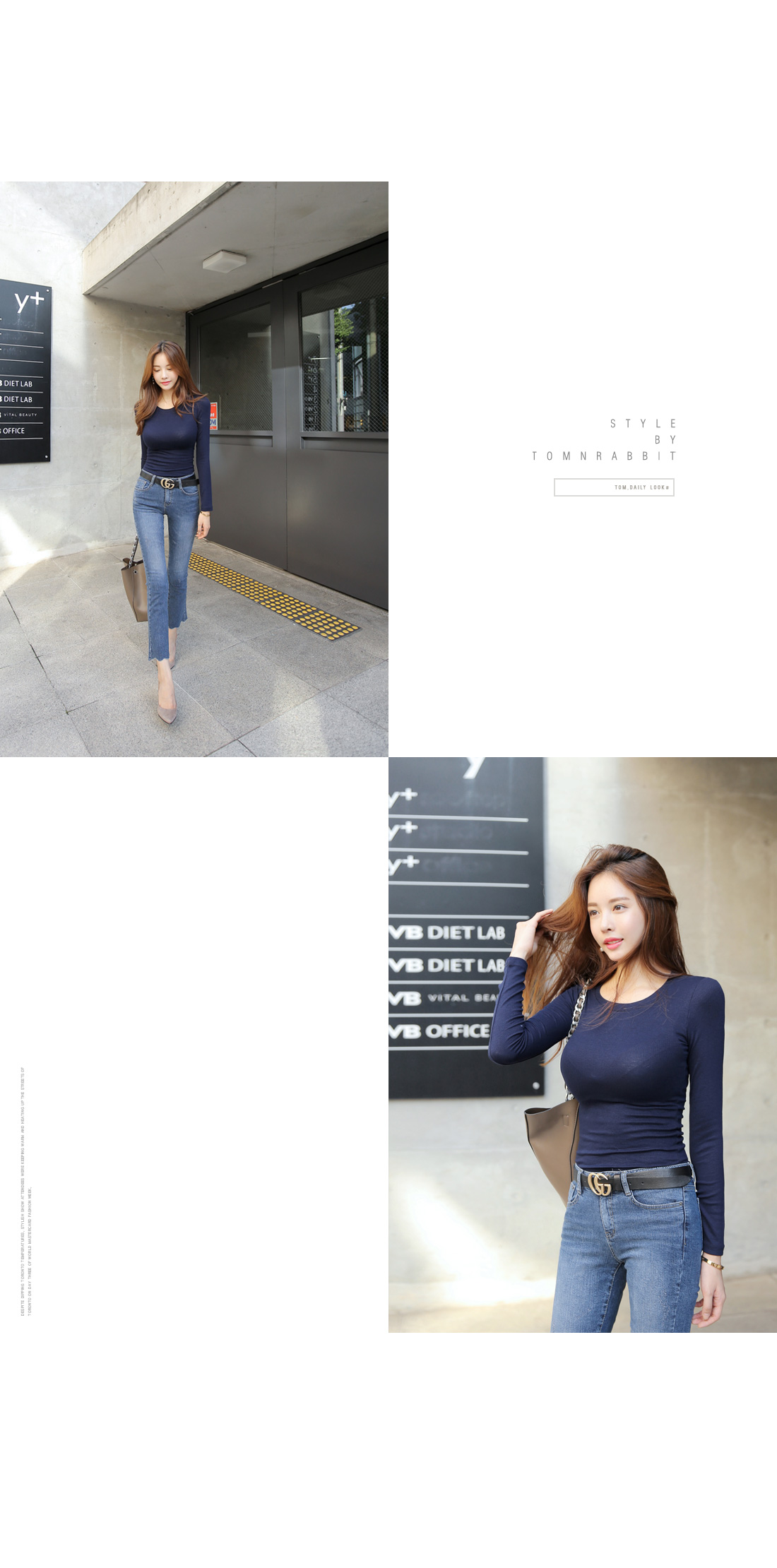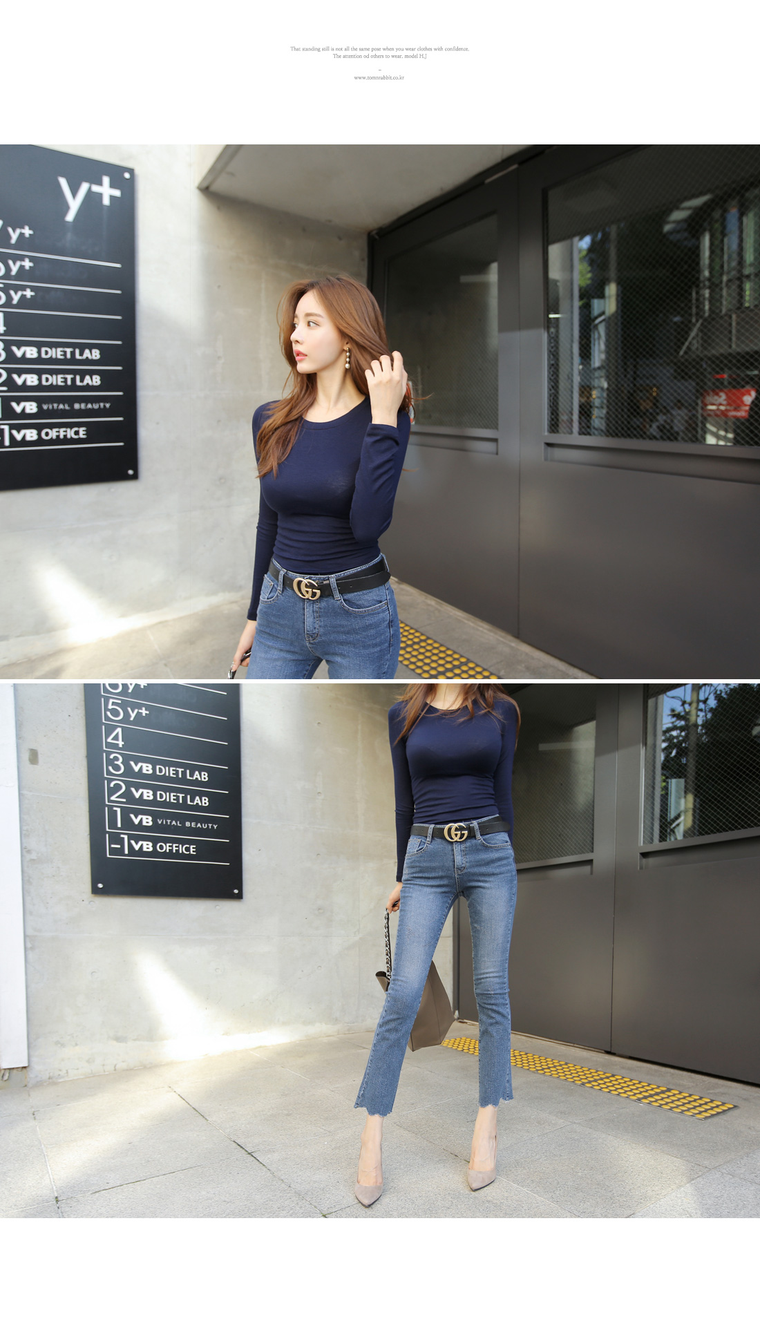 심플한 라운드 네크라인에 촘촘한 골지 짜임으로 제작되어 바디 라인을 한층 더 날씬하게 연출해주며, 자켓이나 가디건 안에 이너티로 연출해도 잘 어울려 활용도가 높아요.