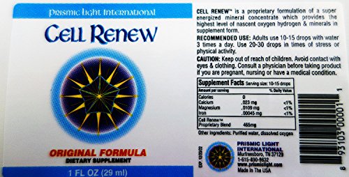 -. Binding : Health and Beauty -. Brand : Cell Renew -. EAN : 8931030000116 -. Feature : Cell Renew combines Lee Reynold's original formula, enhanced with minerals, enzymes, & amino acids, along with Prismic Light's proprietary, highly energized water, rich in free hydrogen & oxygen ions / This improved 'Super Cell' product today emerges as Cell Renew, a multi-dimensional, super energized, life energizing liquid. It is advanced nutritional technology at its very best. / Many scientists agree that the cause of degenerative disease is caused by a lack of oxygen in the blood stream, organs and other body tissues / Cell Renew helps create more oxygen by its release from the water molecule - support your body's ability to achieve optimum health & longevity - the supplement of choice for many professional athletes / Cell Renew mixed with water, juice or energy drink - generates more oxygen & hydrogen - cleans the blood stream - increases the effectiveness of vitamins, herbs, and nutrients by four to five times -. Label : Prismic Light International -. LegalDisclaimer : These statements have not been evaluated by the Food and Drug Administration. This product is not intended to diagnose, treat, cure or prevent any disease. -. Manufacturer : Prismic Light International -. MPN : Cell Renew -. PackageQuantity : 1 -. PartNumber : Cell Renew -. ProductGroup : Health and Beauty -. ProductTypeName : HEALTH_PERSONAL_CARE -. Publisher : Prismic Light International -. Studio : Prismic Light International -. Title : Cell Renew: Oxygen, Hydrogen, Trace Minerals, Enzymes and Amino Acids Liquid Drop Supplement: Today's Most Advanced Oxygen Product - # 1 Health & Energy Supplement. Powerful Antioxidants Clean Up Free Radicals. Helps Detoxify & Balance pH. Boosts Athletic Performance