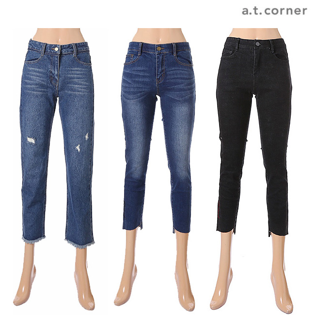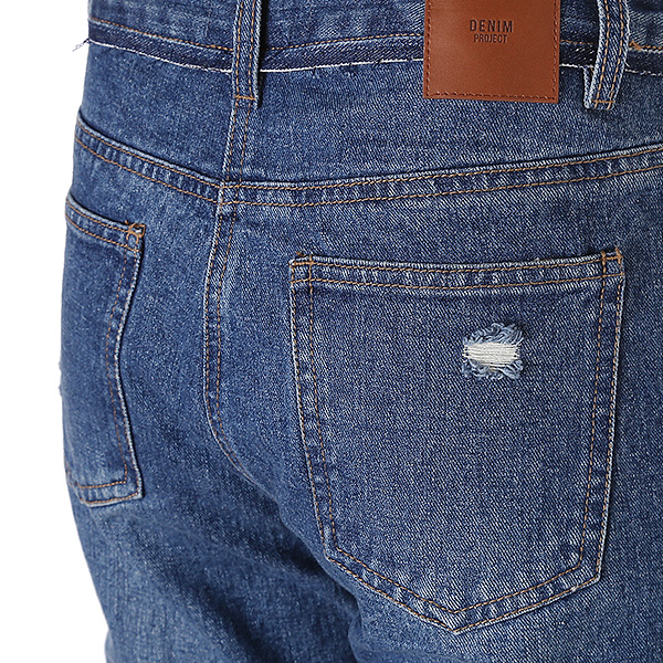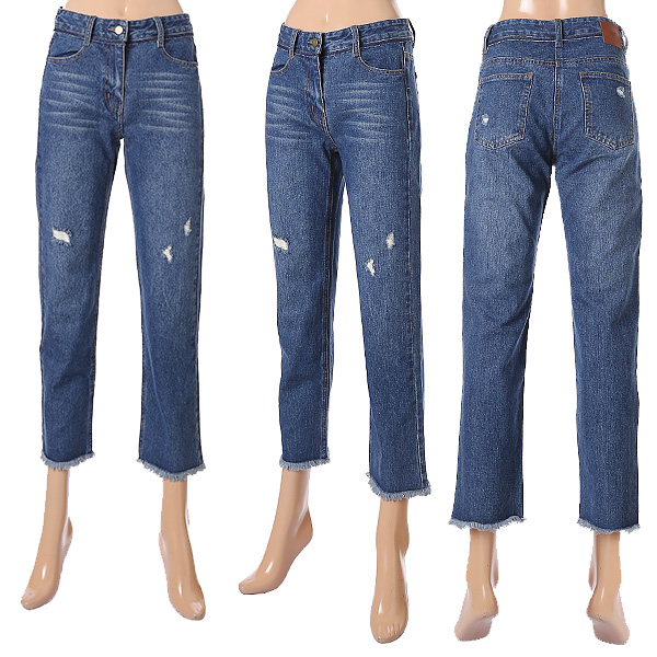 블루 색상의 데님 팬츠로 자연스럽게 떨어지는 핏 라인이 멋스럽습니다. 과하지 않은 데미지 디자인과 밑단 프린지 장식이 세련되면서 빈티지한 분위기를 연출해 줍니다.