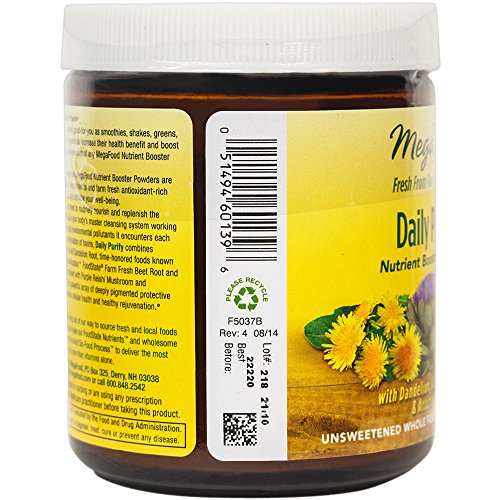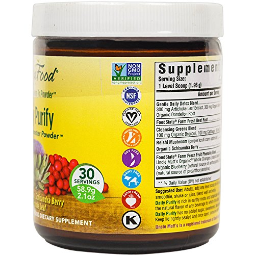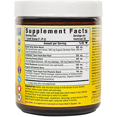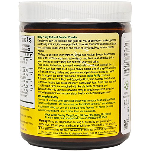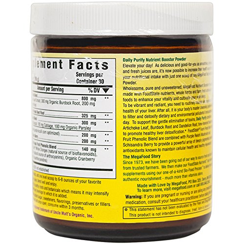 NATURAL INGREDIENTS: Artichoke leaf, burdock root, and dandelion root have come together to for the Gentle Daily Detox Blend found in the Daily Purify from MegaFood. Fruit and berries have also been included, such as oranges, blueberries, and cranberries which combine to create the FoodState Farm Fresh Fruit Phenolic Blend.